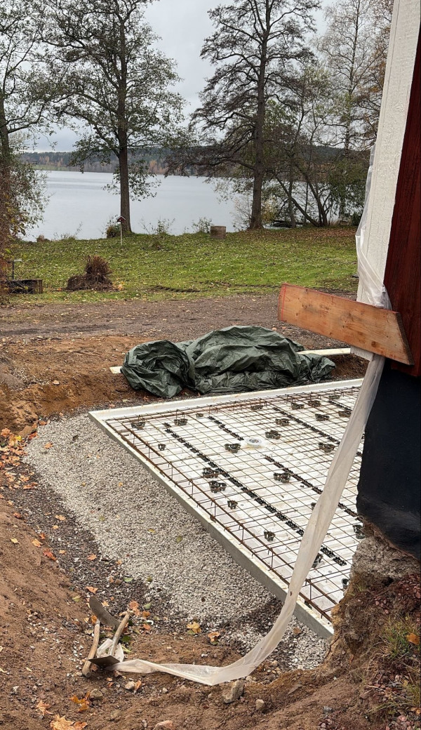 Kantbalk i mitten, randisoleringen syns under gruset, och isoleringsarbetet pågår. Ovan på denna grund skall det stå ett enplanshus.